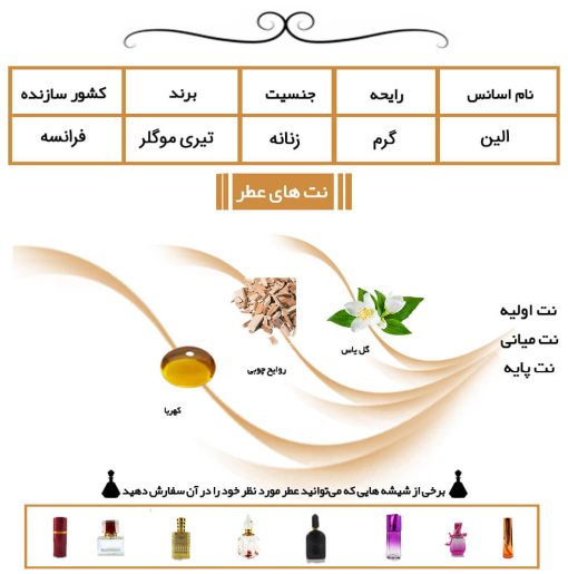 عطر زنانه الین Alien یک انتخاب بی نظیر در سال 2005 توسط کمپانی تری موگلر به بازار عطریجات آمد. عطر زنانه الین با رایحه ای گرم و ملایم و گروه بویایی گلی باعث شده که به یک عطر چهار فصل تبدیل شود و در تمامی طول سال مخصوصا فصول سرد سال قابل استفاده باشد.