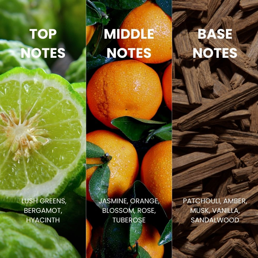 - رایحه میانی:گل یاس، شکوفه پرتقال، گل رز، گل سرخ